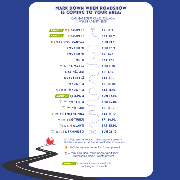 CAR SEAT ROADSHOW 2025 - Car seat experts tour from the biggest children's product provider in Finland. You can find the schedule on this page.