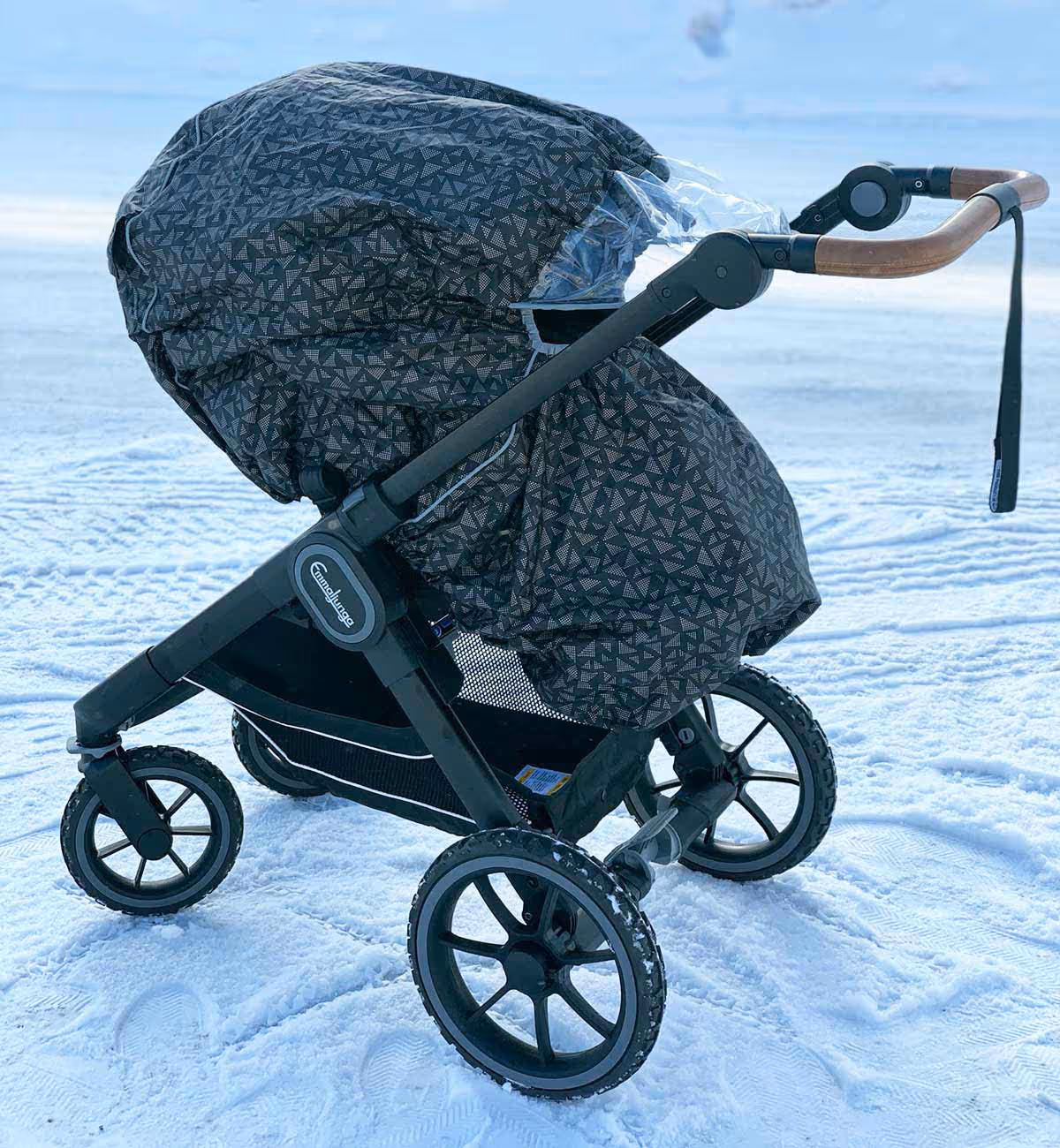 Travelling in snowy and slushy weather is also facilitated by locking the front wheels, which rotate 360 degrees, only to point forward, so that the carriages travel more steadily and do not roll over. There are many options for the front wheels of different brands of wagons that make carriage walking easier in winter weather e.g. bigger wheels.