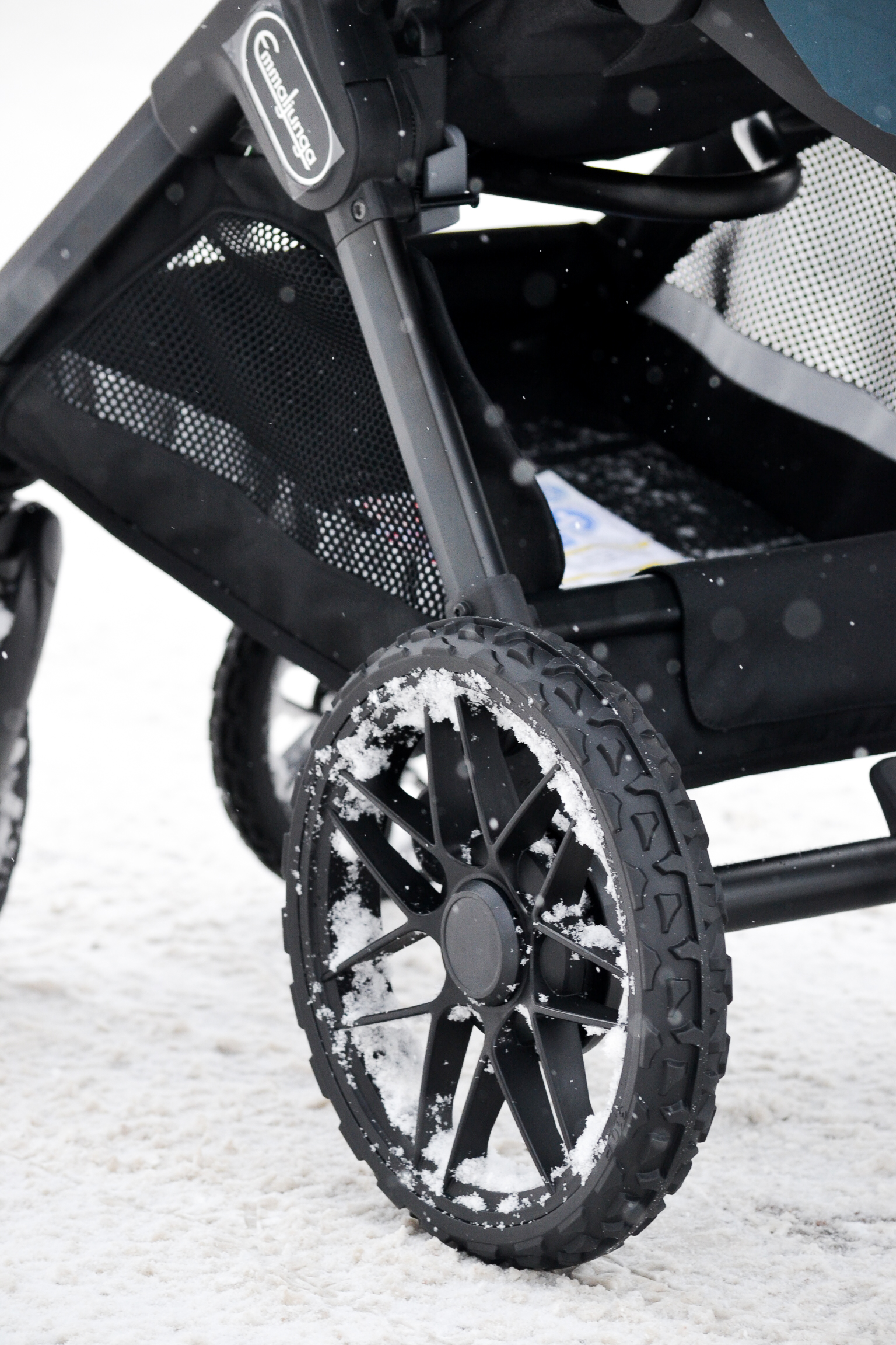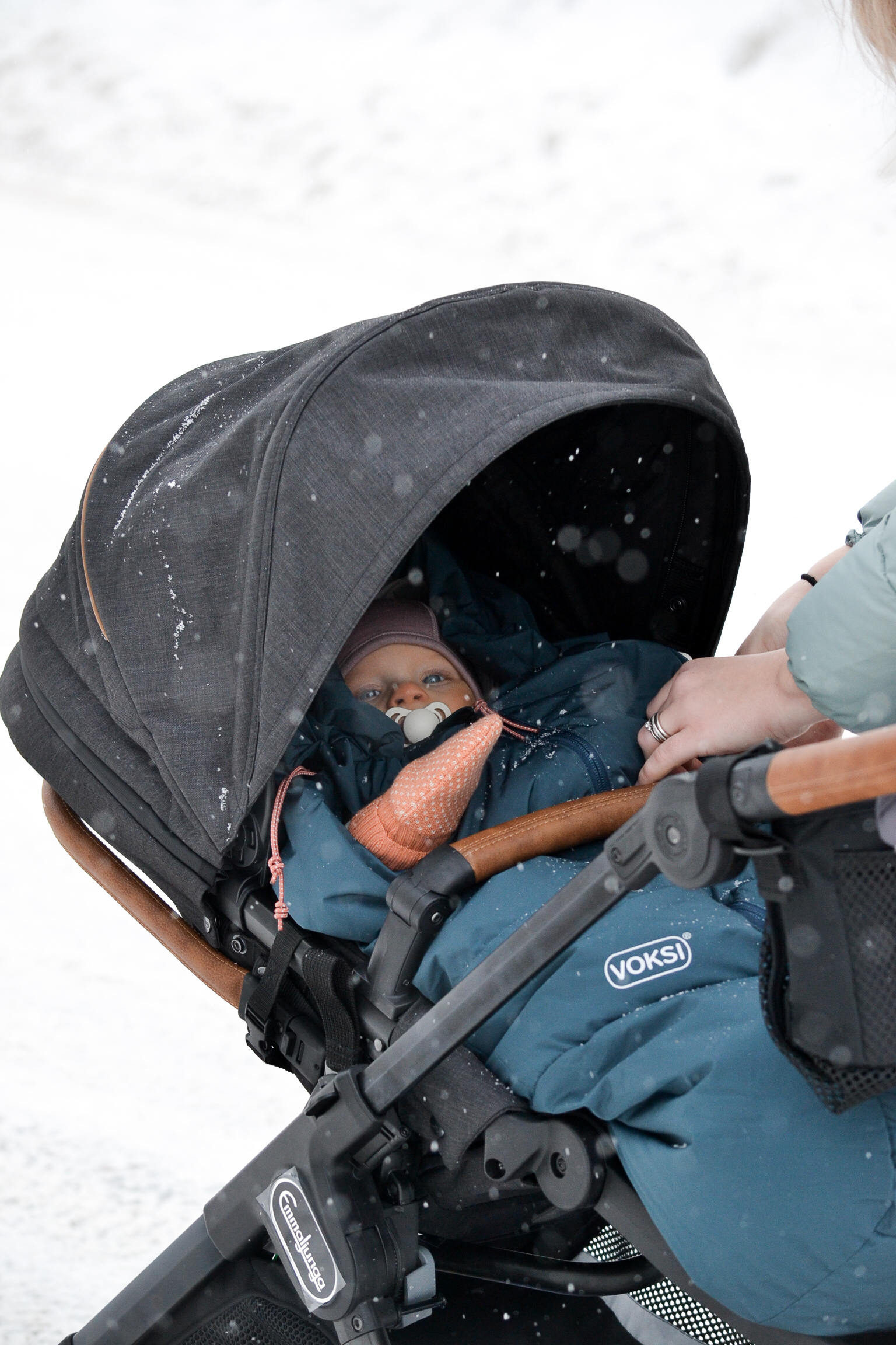 Tyylikkäät Emmaljunga-lastenvaunut kauniissa talvimaisemassa lumisen taustan kanssa.